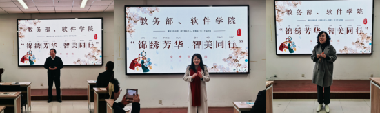 活动伊始,软件学院党委书记张文基、教务部部长宋燕先后发表致辞,向在场全体女职工致以节日的诚挚问候与美好祝福。张文基书记表示,希望以此次活动为纽带,深化两部门共建情谊,让女职工在非遗文化的浸润中放松身心、滋养心灵,充分展现新时代女性的自信与风采。宋燕部长强调,女职工是教育教学与学院发展中不可或缺的“她力量”,此次活动旨在以文化赋能,丰富女职工精神生活,进一步凝聚巾帼合力,助力各项工作再上新台阶。